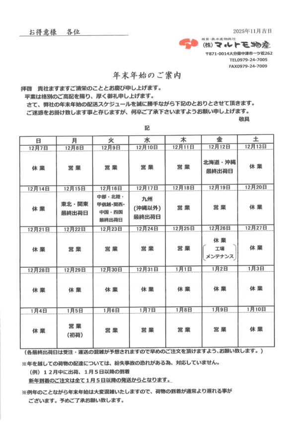 【年末年始のご案内】 2025年12月4日 マルトモ物産年末年始の営業日、最終出荷日・年始出荷日のご案内です。 改めてご確認お願いします。 特に、年末年始は運送が混み合い、通常よりも日数がかかりますので、お早めにご注文くださいませ。 前の記事 >